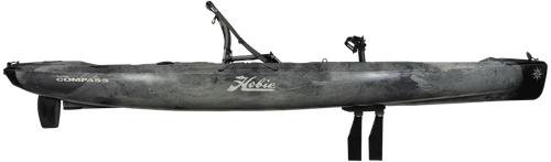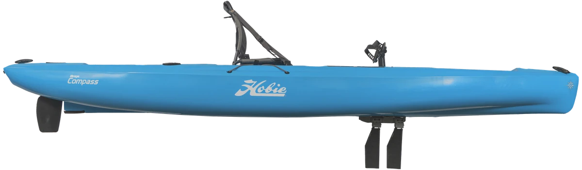 The new Hobie Mirage Compass pedal drive kayak is a new budget offering, making the performance of the Mirage MD180 KickUp Pedal Drive more available to the masses. The 12′ Compass is a blend of the popular Outback and Pro Angler models, in a slightly more stripped down version to keep the cost down. The Compass features the MD180 KickUp Pedal Drive, upgraded anodized aluminum alloy frame seat offering incredible comfort, recessed spring-loaded rudder, simplified steering, generous cargo room, Lowrance Ready transducer mount, and the all new Hobie H-Track for easy accessory customization.